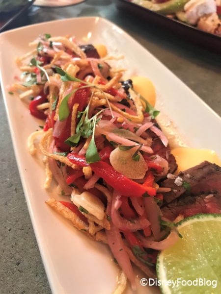 First up, the Lomo Saltado – Peruvian Flank Steak. Other variations of this item have been on the menu in the past, but this is a new iteration. This version is Grilled Flank Steak and Piquillo Peppers, with Pickled Onions, Crispy Potatoes, and comes with a Tamari-Lime dressing and Yellow Pepper Aioli as well as a fresh lime to squeeze on top.