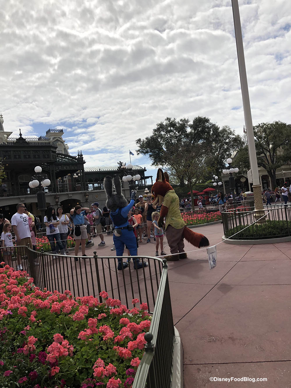 As part of Mickey & Minnie’s Surprise Celebration you’ll find rarely-seen-in-the-parks characters in the Town Square area. We got to see Nick and Judy from Zootopia on the day we were in the park — see who else we’ve seen here!