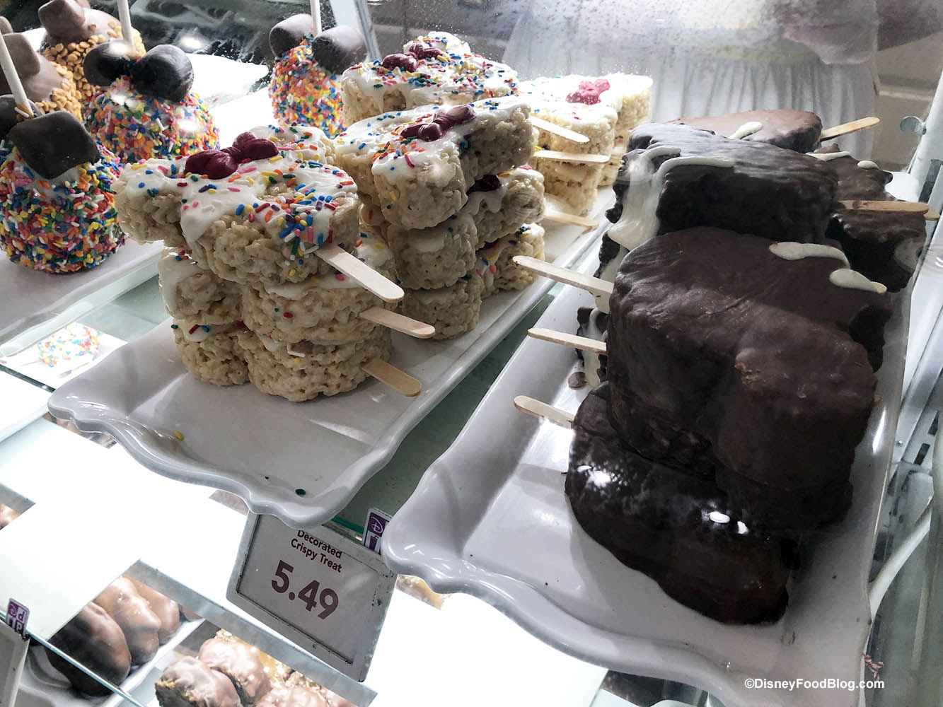 The sweetest spot on Main Street, The Confectionery, has both the Mickey Ice Cream Bar krispie treat AND the Minnie Donut krispie treat in their bakery case!