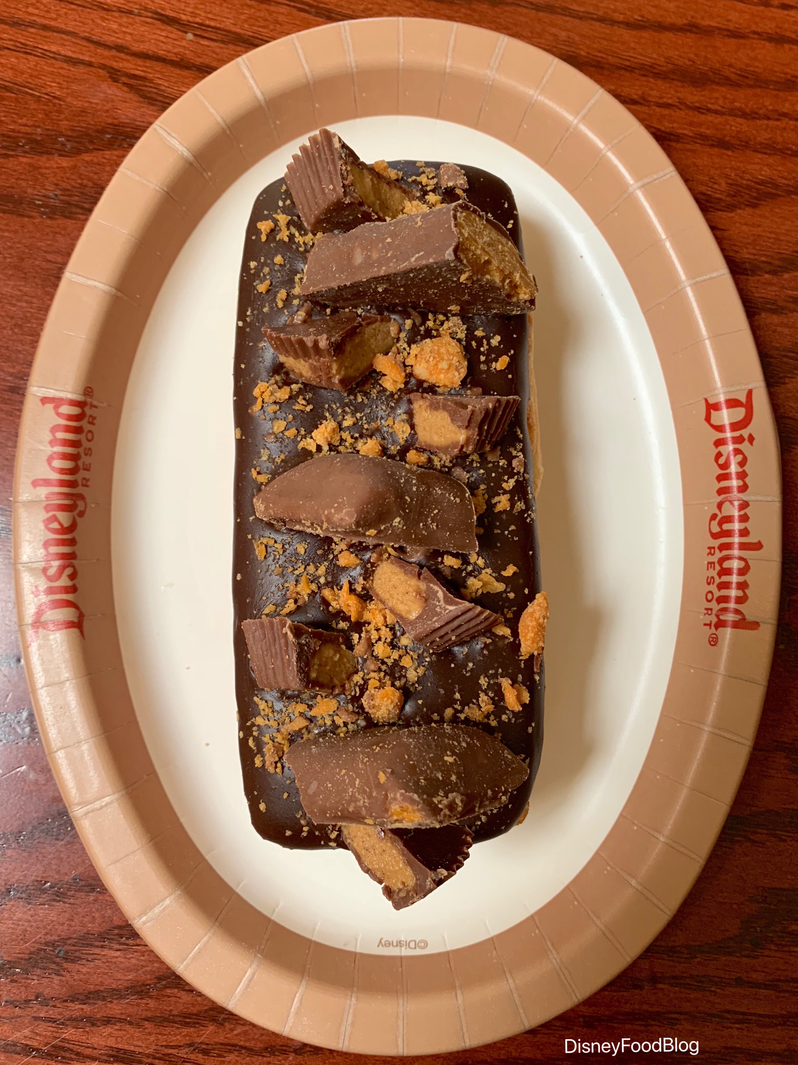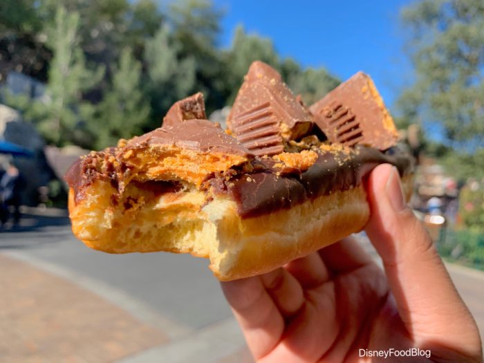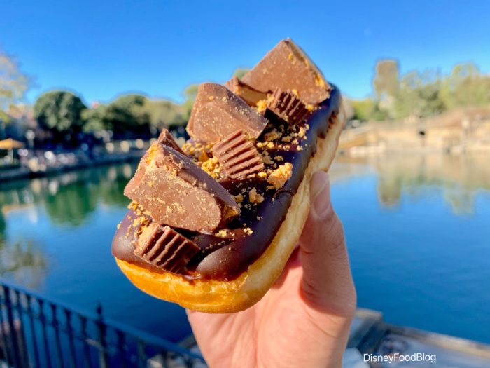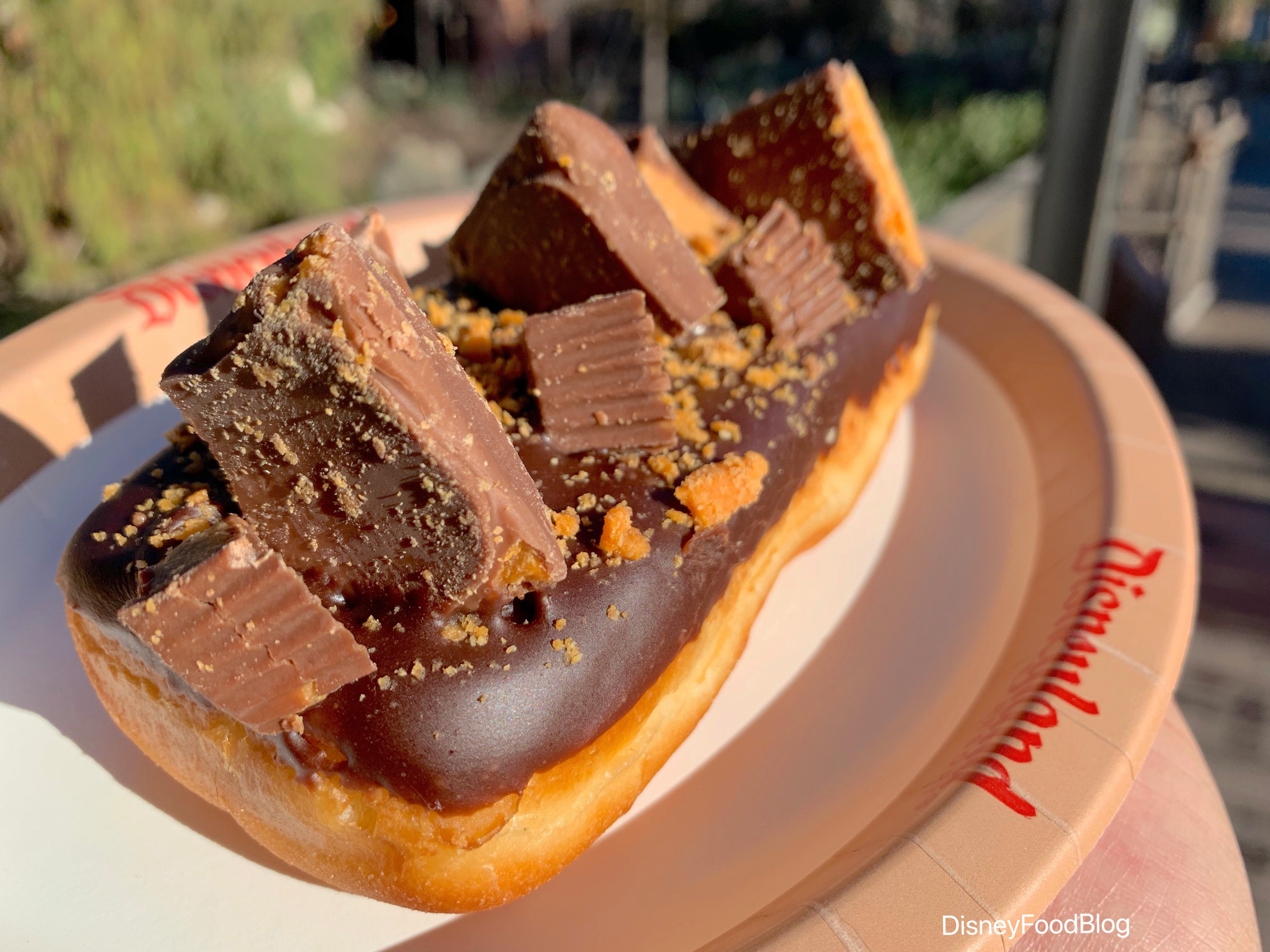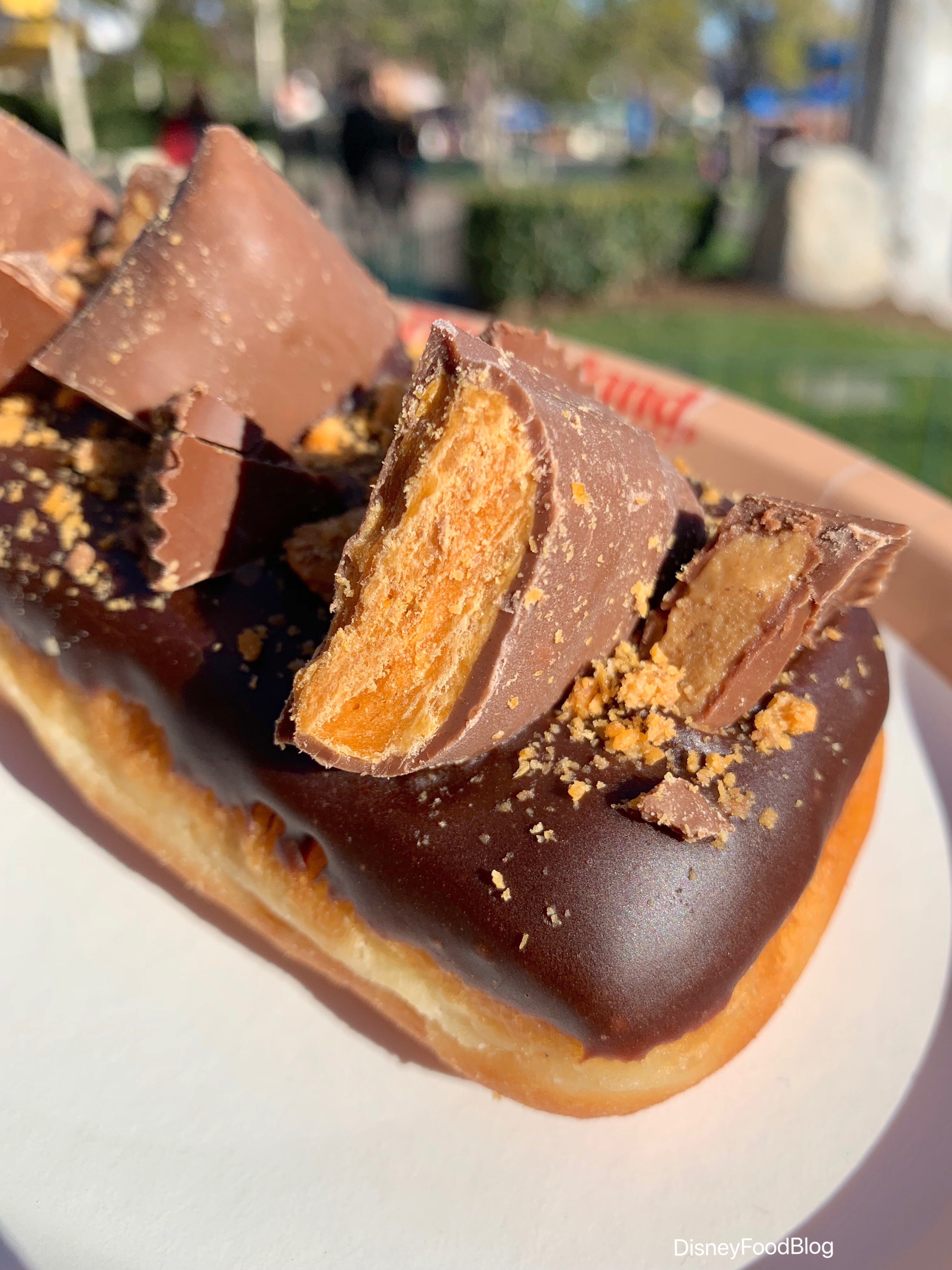 Believe it or not, this donut is nearly the entire length of a Disneyland entree plate. It’s made even more substantial by the huge chunks of Peanut Butter Cup and Butterfinger that are pressed into the top.