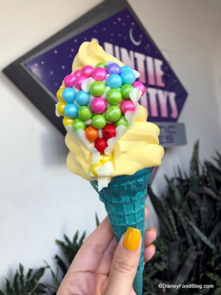 It’s filled with mango soft-serve (which we confirmed is Mango Dole Whip!) garnished with the signature “balloons” from Up!