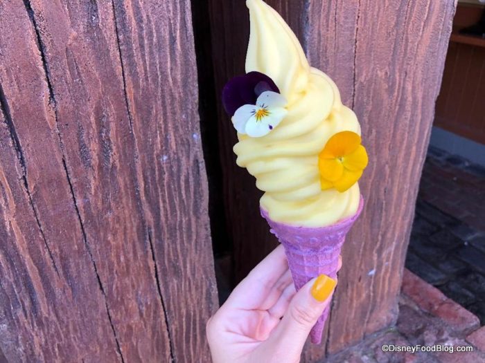 But what makes this cone especially unique, visually, are the edible flowers which garnish the soft serve to mirror the flowers that decorate Rapunzel’s braided hair.
