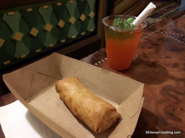 Chef Alfredo, who has been with Disney for over 15 years, spoke while we enjoyed some Adventureland items: the Buffalo Chicken Spring Roll and the Schweitzer Falls Slush.