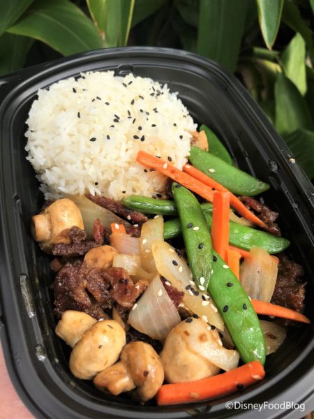 We grabbed some hot sauce, and off we go! First up, the Teriyaki Beef Bowl. This dish is Marinated Beef, Carrots, Snap Peas, Onions, and Mushrooms in a Sweet Teriyaki Sauce and served with White Rice.