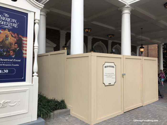 There are some new construction walls outside the main entrance to the American Adventure building. No announcements have been made about this new work; we will let you know when we learn what these are hiding.