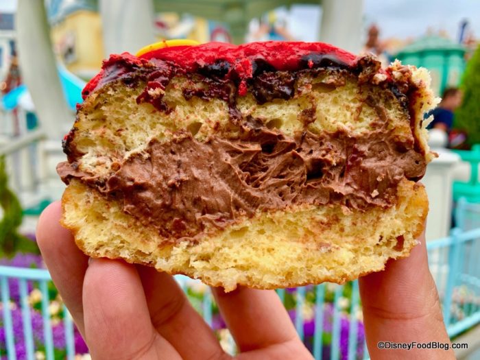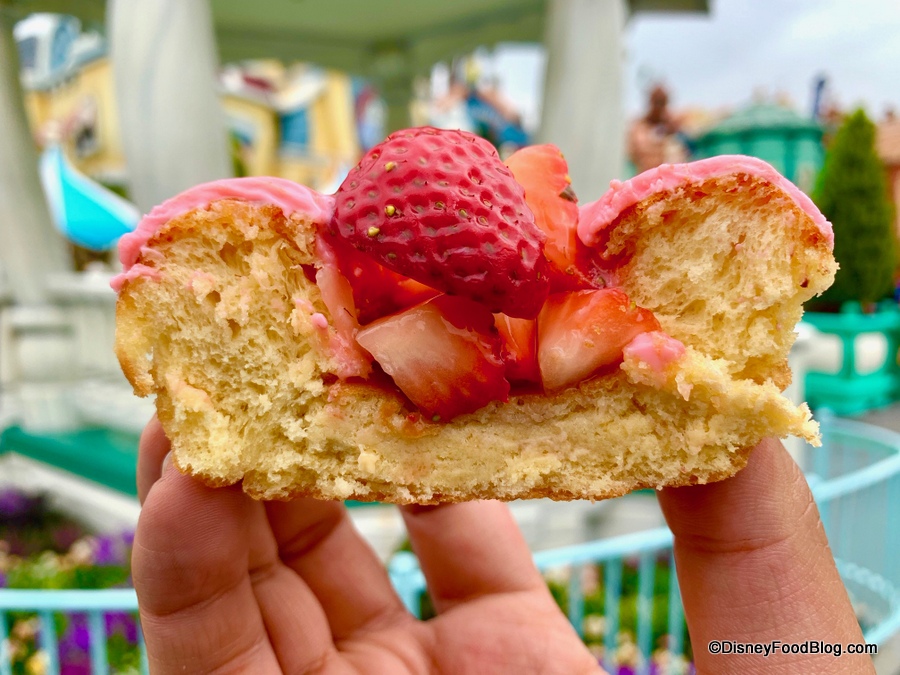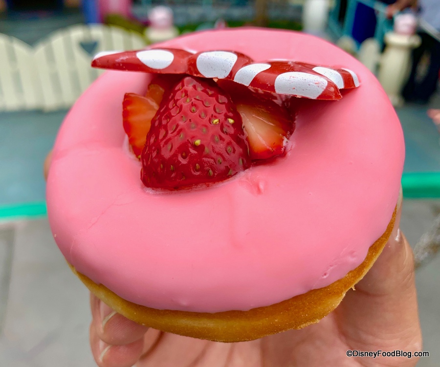 The Minnie Mouse Donut starts with a yeast donut as well, but it’s not sliced. Instead, there’s a small dip in the middle that’s filled with chopped strawberries. There’s also the ubiquitous white chocolate Minnie bow.