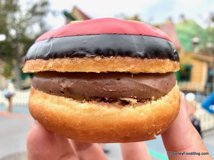 The Mickey Mouse Donut is a yeasted donut sliced lengthwise — bagel style. It’s glazed with red and black and topped with two yellow chocolate Mickey buttons! You definitely feel the spirit of the Mouse with this design!