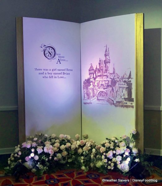 And the beauty doesn’t stop there. Once inside the reception space, the happy couple can opt for this storybook design customized with their names and featuring a sketch of Sleeping Beauty Castle.