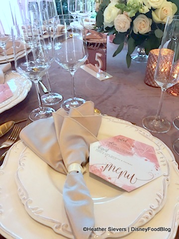 Those elegant stops include lovely dinnerware, linens, and personalized menus.