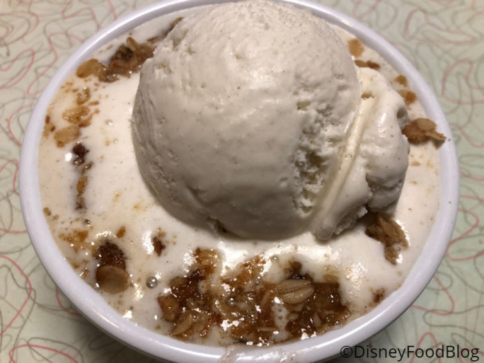 Desserts at 50s Prime Time will probably look familiar to you. First up: Warm Apple Crisp a la Mode. This is a bowl of canned apple pie filling, basically, topped with a brown sugary, oaty crisp. When served warm with ice cream, it’s a little overwhelmed by melted cream, but it’s all soupy and delicious when mixed together. And I’m okay with it!