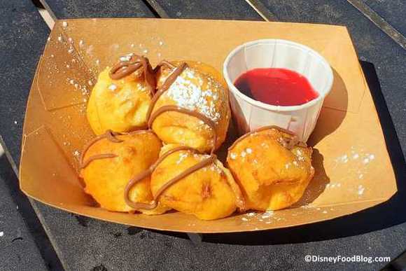 is a must-stop for Zeppole! These Ricotta Cheese Fritters are topped with Powdered Sugar, Raspberry Sauce, and a Chocolate-hazelnut Drizzle.