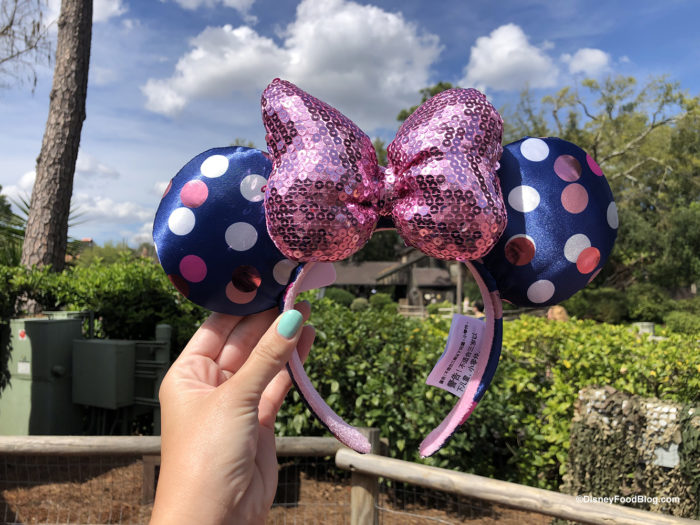 We spotted some new Minnie Mouse ears that are similar to the Rock the Dots ears that came out earlier this year. This newer version is covered in pink and white dots instead of the multi-colored dots on the Rock the Dots ears.
