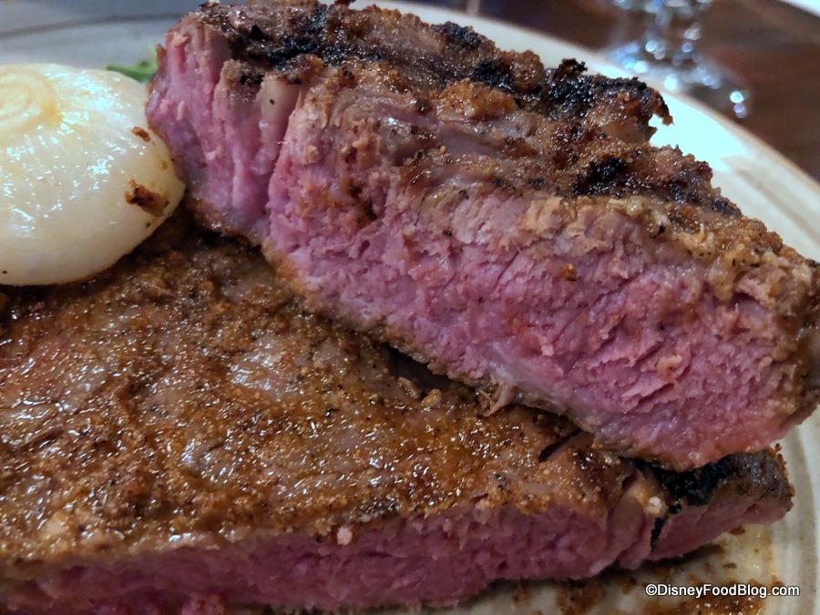 The big ticket items at Kona Cafe are found on the Dinner Offerings where the 20-oz. Bone-In Black Angus Ribeye comes in at $55! (If you’re on the Disney Dining Plan, this is a big value for you… except you’ll likely need to order a side.) The ribeye is a beautiful cut of meat, and the grill marks and visible seasoning are really compelling. Arugula and a braised cipollini onion are the only accompaniments, and they’re definitely more garnish than side dish.