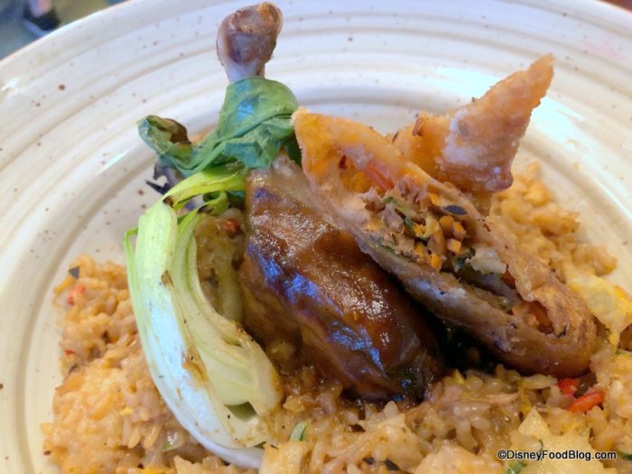 The Duck Fried Rice with Confit Leg is one such island-forward dish. Fried rice is dotted with peppers, onion, shitake mushrooms, small bits of duck, and egg. A fried spring roll on top also contains duck. Bok choy provides a bit of color. Overall, the fried rice was sweeter than expected, and delicious.