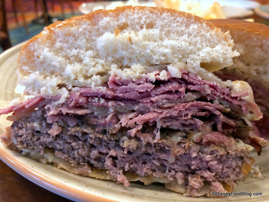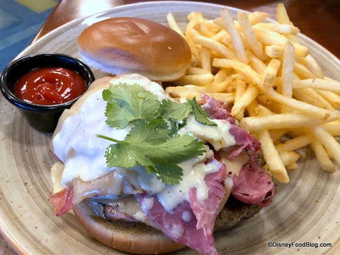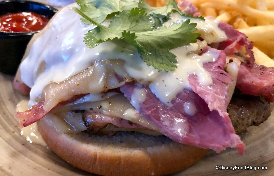 The Big Kahuna Burger is little messy but flavorful. It’s a burger (more on this in a moment!) topped with sauteed pastrami, corned beef, pepper jack cheese, mustard aioli, and tangy cucumber.
