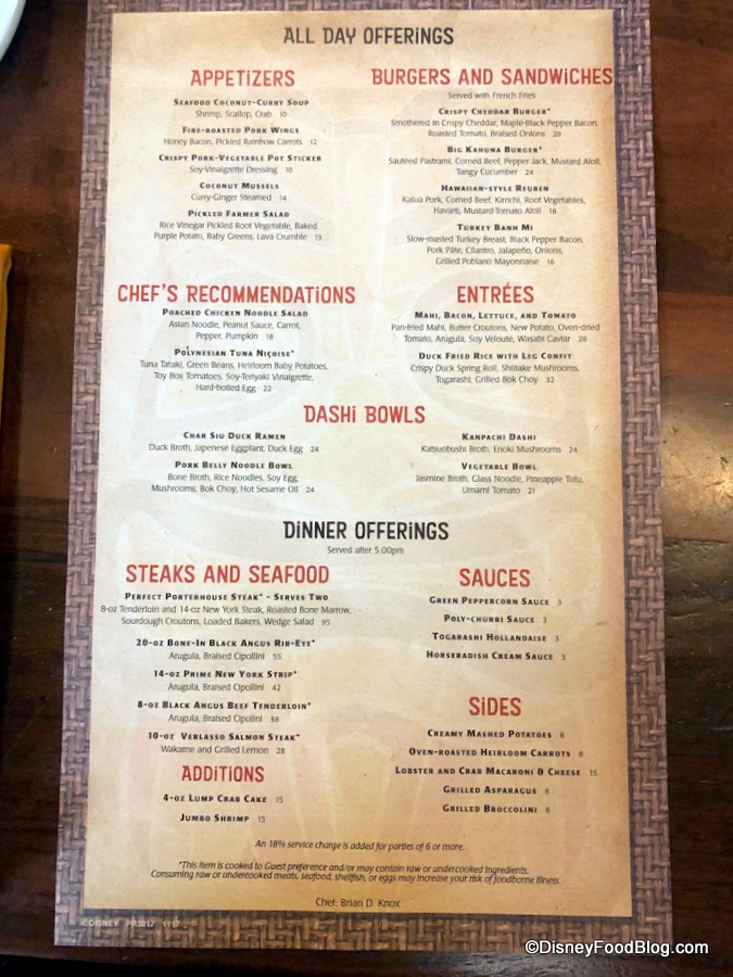 That said, it currently seems to me that Kona Cafe is being presented as a “stand-in” for an absent signature dining experience in the deluxe level and every expensive Polynesian Village Resort. The steakhouse additions to the menu and high-end ($$$) options are clearly a move to show guests that they don’t have to go to Citricos, Narcoossee’s, or California Grill to get signature-level dining when they’re staying here. But the atmosphere here is still that of a moderate-level dining location, so I think they have a way to go to convince high-paying guests that this is the date night they deserve.