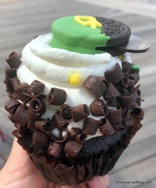 The St. Patrick’s Day Cupcake is chocolate cake, whipped vanilla buttercream, and a fun Oreo that’s been dipped halfway in green. The Oreo is decorated with a pair of gold-painted chocolate discs for Mickey ears and a yellow belt buckle.