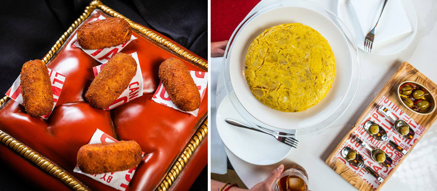 Plates for sharing will feature traditional chicken fritters (Croquetas de pollo) and Aceitunas modernas y clásicas – ‘Ferran Adrià’ liquid olives and gordal olives stuffed with piquillo pepper and anchovy — and a Spanish omelette for the table.