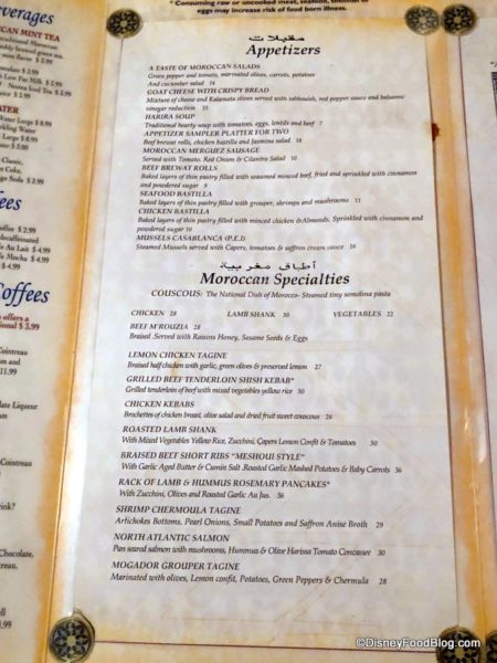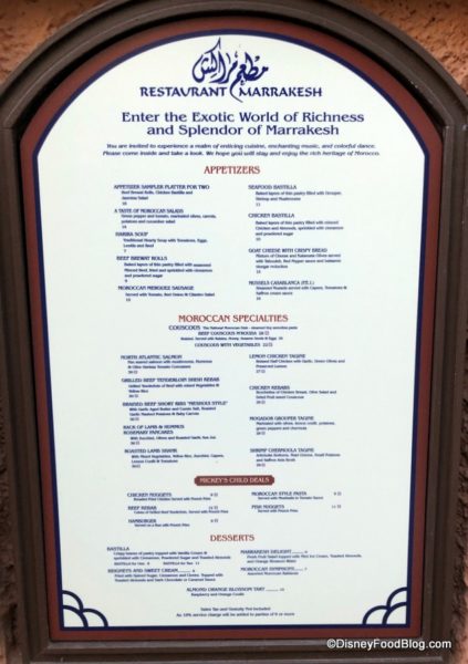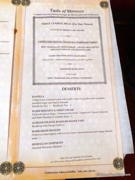 At $52, Restaurant Marrakesh is one of the least expensive Garden Rocks Dining Package restaurants. Its price is matched by Spice Road Table (also located in the Morocco Pavilion), and I recommend going to Spice Road Table if choosing between the two.