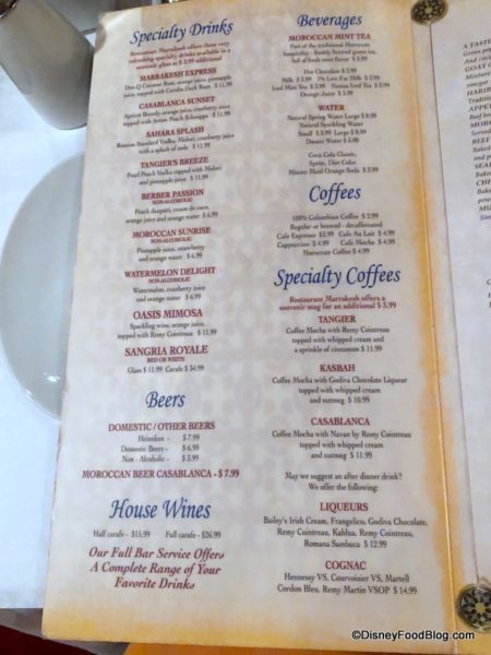 Restaurant Marrakesh is not an Epcot must-do. While the details in the decor are beautiful and something worth appreciating up close, the food is a downer…at least it was on this visit. And that’s disappointing because we know the Morocco Pavilion was designed and built with care. The pavilion draws guests in to explore its winding paths and stores packed with beautiful collectibles. Unfortunately Restaurant Marrakesh fails to engage the diner with the vibrancy that the pavilion otherwise celebrates. We’d love to see a menu overhaul that is inspired by the energy of a country rich in culinary history and nuance.
