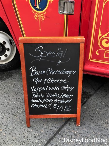 It listed a special item: Bacon Cheeseburger Mac & Cheese. The description matches the one released earlier this month for the upcoming Mac & Cheese Truck. While the Cast Member said she could not confirm that it’s the same dish coming to the Mac & Cheese Truck, she did give a smile and a bit of a wink along with it…