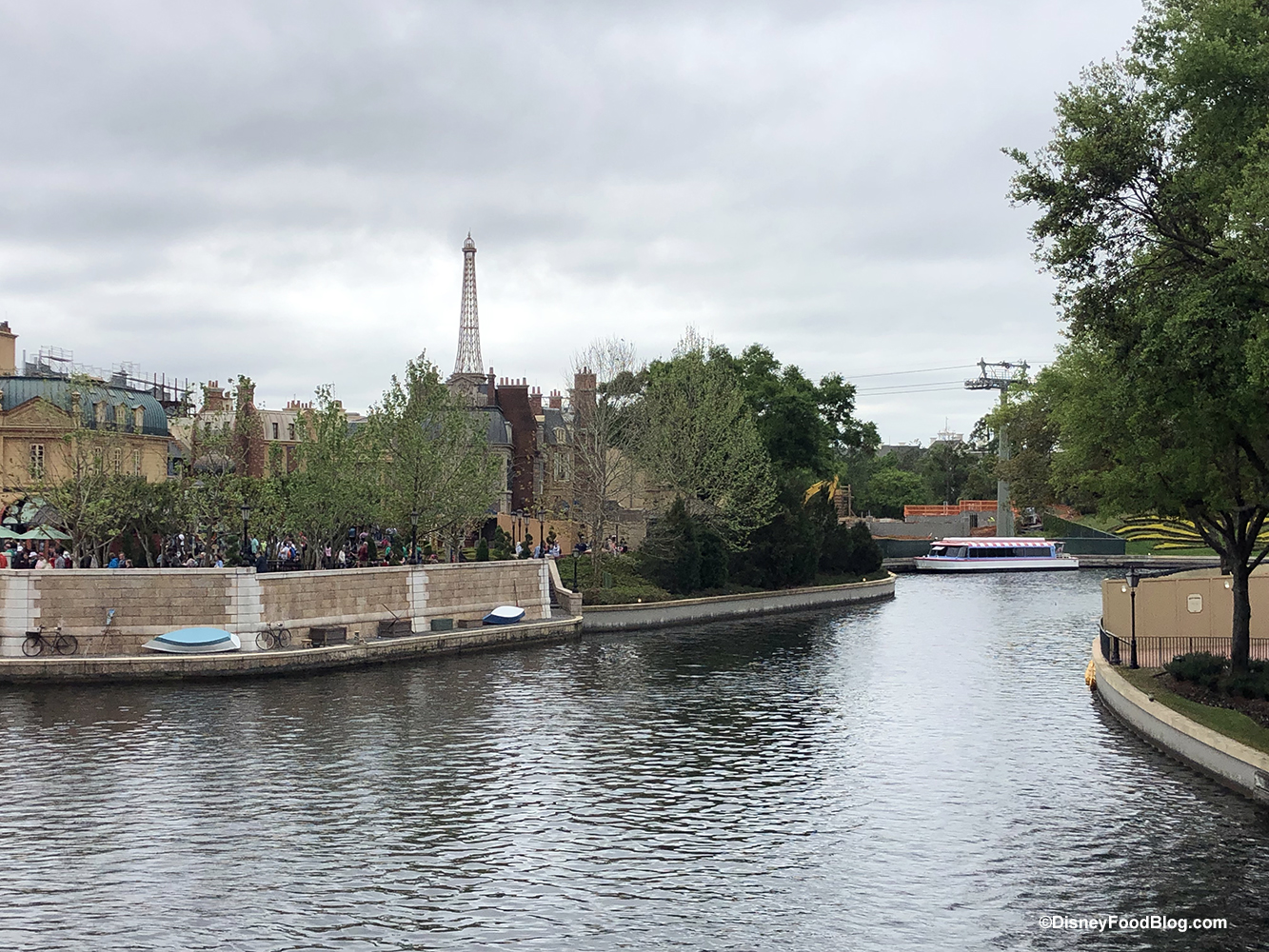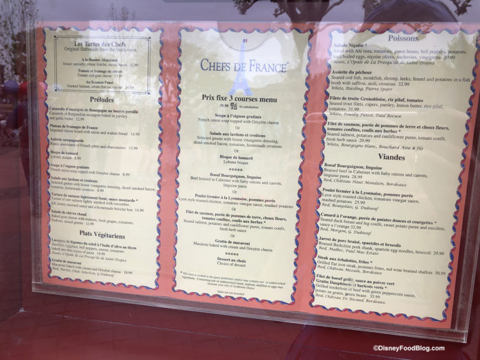 In addition to the construction in this changing pavilion, you’ll also find changes at Les Chefs de France. A new Assiette du Pecheur replaces the Assiette de la Mer Florentine, Canard a la Orange replaces the Canard aux Cerises, and there is a new Filets de Truite Grenbloise. Bon Appetit!