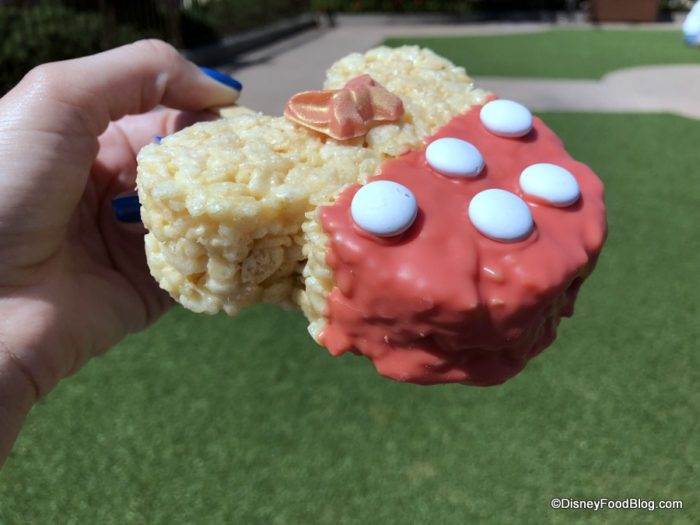 Minnie Mouse’s signature bow and polka dots adorn the Briar Rose Gold Minnie Krispy Treat.