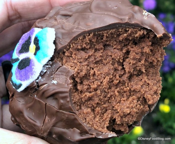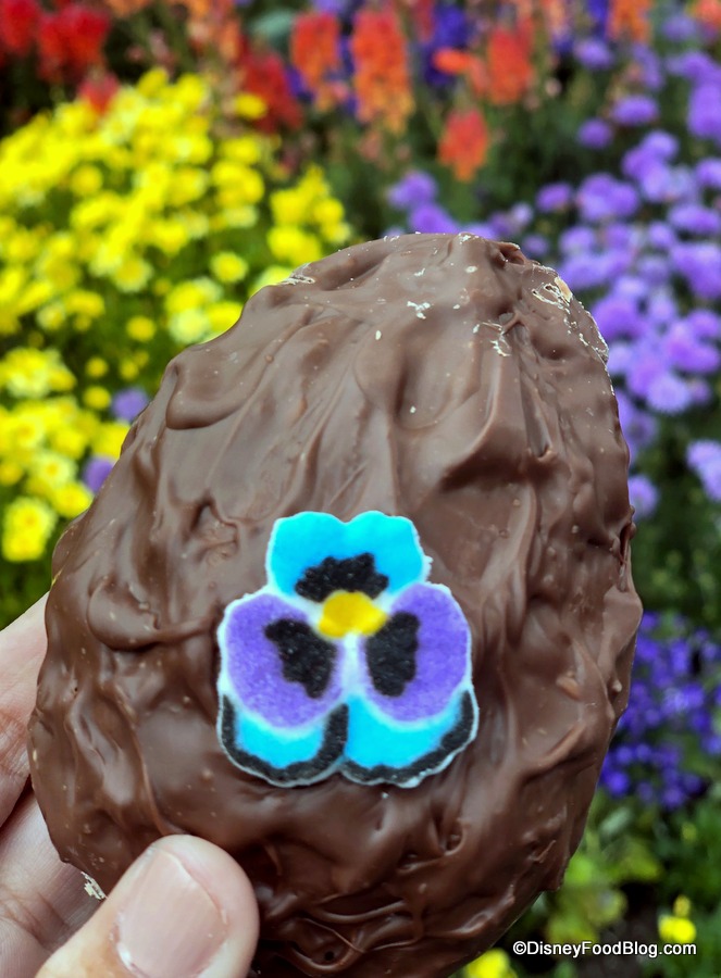 The new packaging really shows off the egg, and we love that about it. The Chocolate Cream Fudge Egg is decorated with a purple and blue sugar pansy.