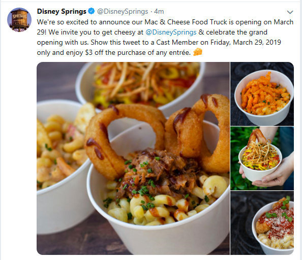Tomorrow, March 29, 2019, is the day you will find this new truck parked on the west side of Disney Springs starting at Noon. Even better? According to the tweet from @DisneySprings pictured above, you can get $3 off your first dish of Mac and Cheese by showing the tweet to a Cast Member (tomorrow only)!