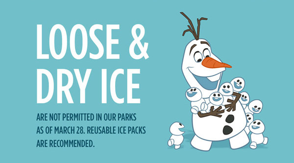 (our publishing date is March 28, 2019) loose and dry ice are no longer permitted in the parks.