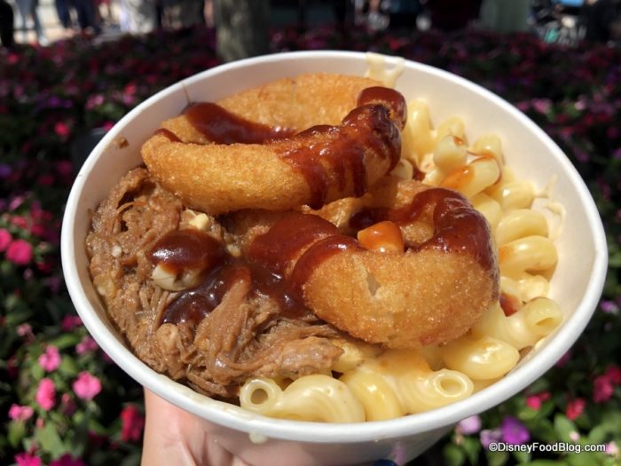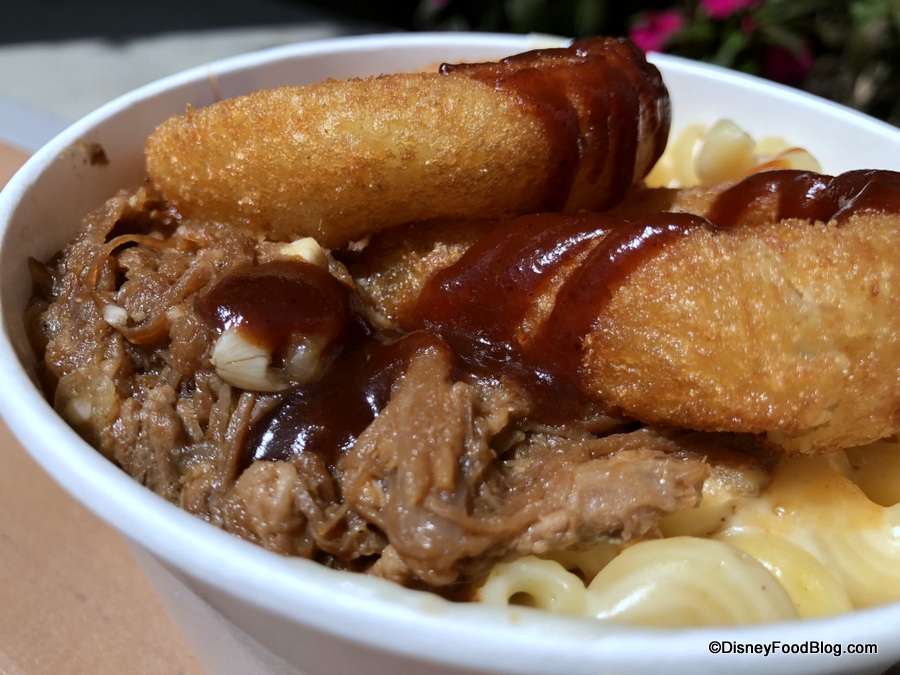 The Smoked Brisket Macaroni and Cheese features cheddar and smoked gouda mac topped with smoked brisket, barbecue sauce and onion rings. (It somewhat resembles the similar mac and cheese entrée at Flame Tree Barbecue in Animal Kingdom.)