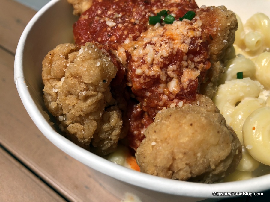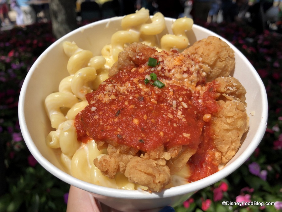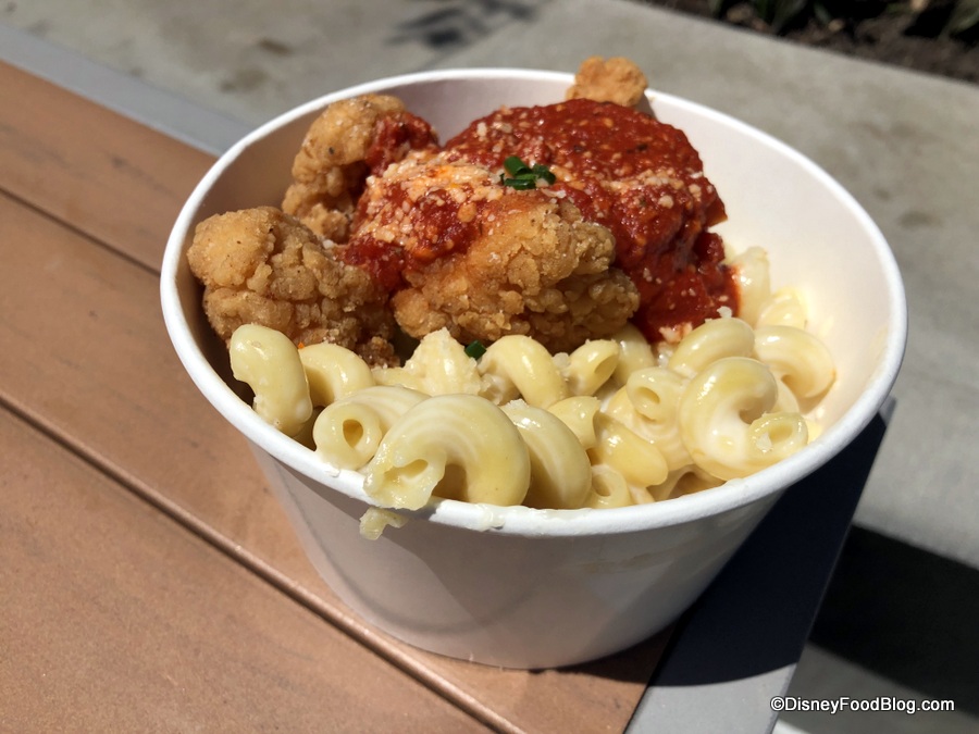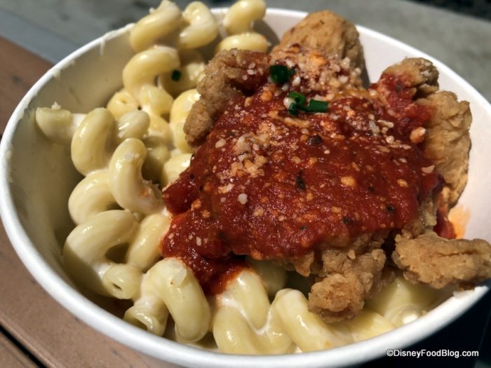 Chicken Parmesan Macaroni & Cheese is made with parmesan Alfredo sauce and topped with crispy fried chicken (of the classic Disney Counter Service Chicken Breast Nuggets variety!), marinara, Parmesan cheese, and basil.