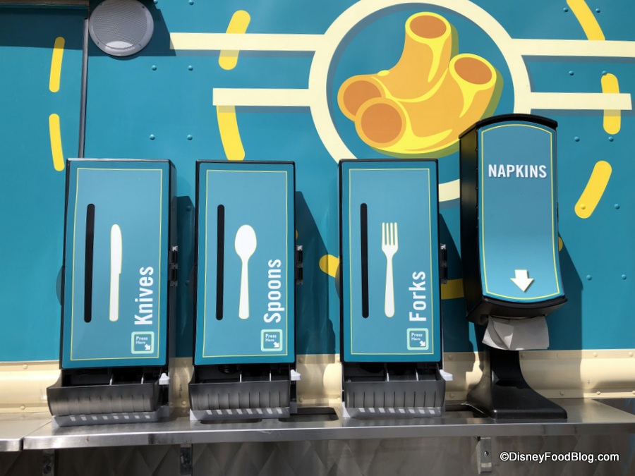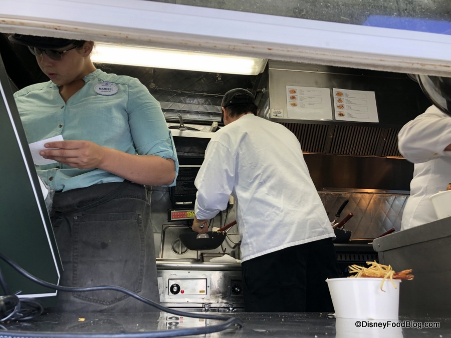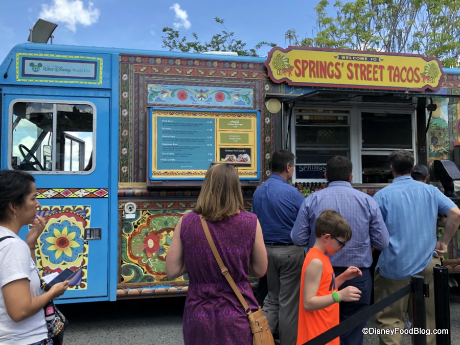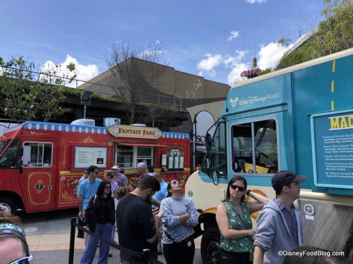 Remember, it can be a little tricky to find the trucks. While you’ll always spot one or two on the West Side, they can park themselves elsewhere. (We’ve occasionally spotted them in the Marketplace right outside the World of Disney store, though that space these days is more often taken by the 4R Cantina Barbacoa Food Truck.)