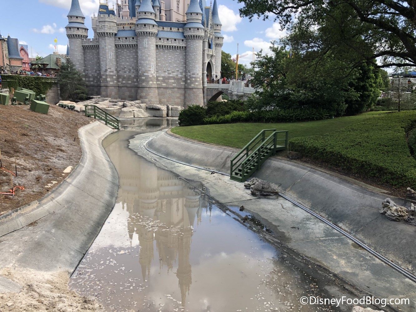The moat around Cinderella Castle is still empty as the project to widen the pathway from Liberty Square to Fantasyland gets underway.