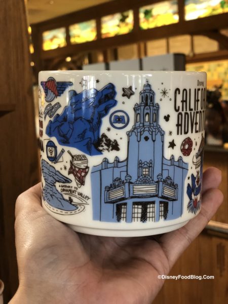 The mugs are $16.99 and currently only available in each parks’ respective Starbucks location. The new mugs are part of the “Pin Drop” collection, and this one features precious drawings of Disney California Adventure, of course!