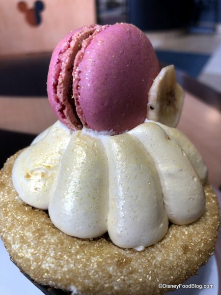 Just peek inside the case and you’ll see the Banana Caramel Cupcake, identifiable by the bonus mini macarons on top! (It’s $5.49 or a Disney Dining Plan snack credit.)