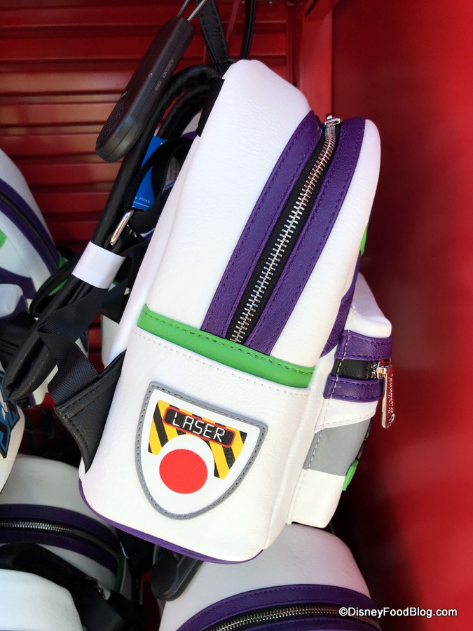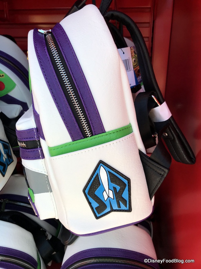 The backpack looks just like Buzz Lightyear’s Space Ranger suit with its vibrant purple and green accents.