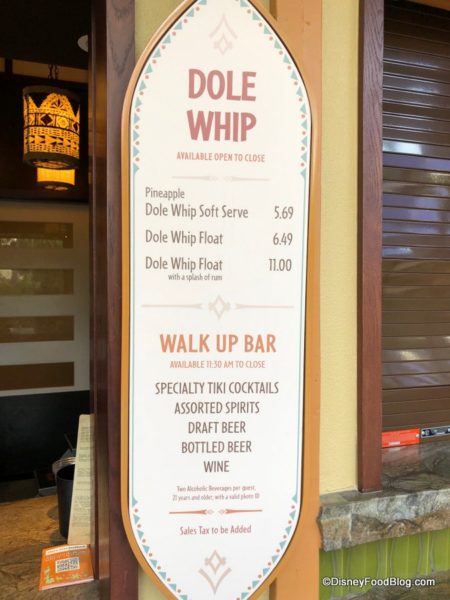 And we did notice an unsettling price increase at Disneyland Hotel’s Tangaroa Terrace‘s Dole Whip window. Here are the old prices: $2.99 for a Dole Whip Soft Serve, $3.69 for a Float, and $10 for a Float with rum.