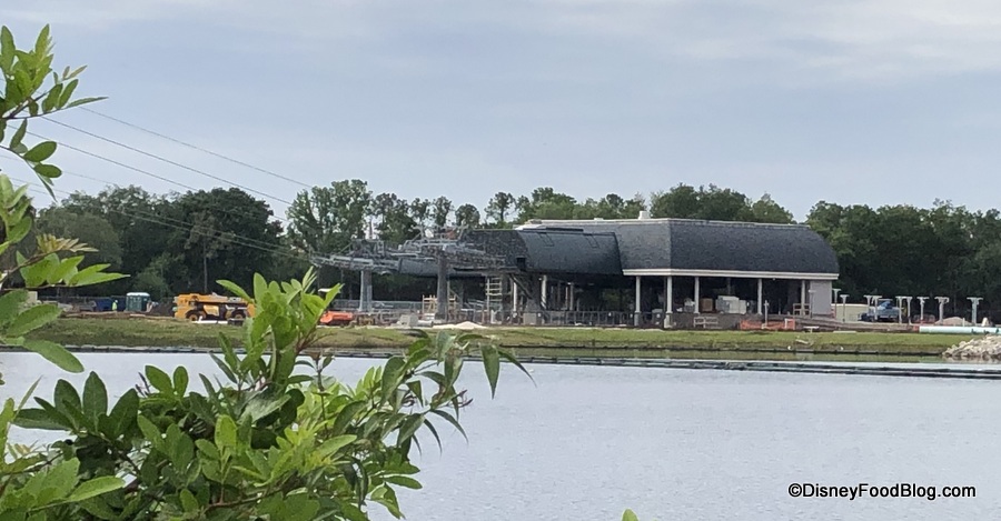 Across the water at Caribbean Beach Resort you might hear a bit of construction noise during the day; since the main pillars of the Skyliner System have been in place for months, most guests won’t experience much of an impact. Caribbean Beach’s own Skyliner station continues to develop, and we can see many gondolas parked at the station. They remain covered in white plastic, but we can get a hint of color beneath the covering!