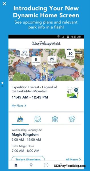 For Disney World app users, your next plans — such as your next FastPass time — is more prominently displayed. Park hours and Extra Magic Hours (when applicable) are more easily seen as well.