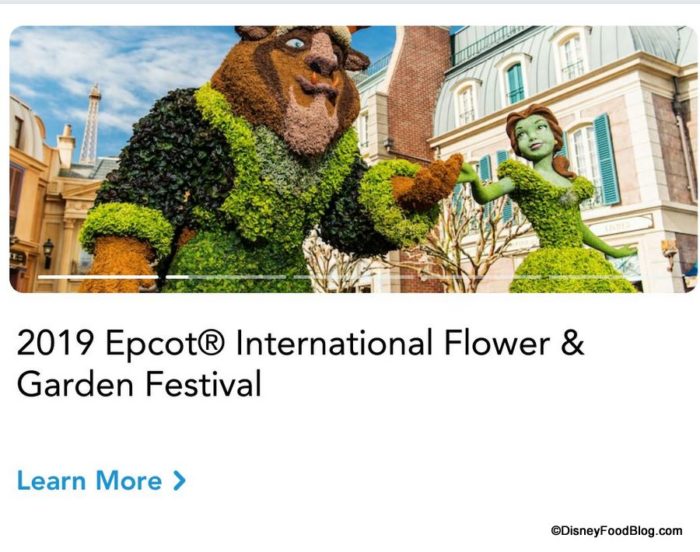 The slider also features current Festivals (which are included with park admission) such as the 2019 Disney California Adventure Food and Wine Festival for Disneyland, or the 2019 Epcot Flower and Garden Festival for Disney World.