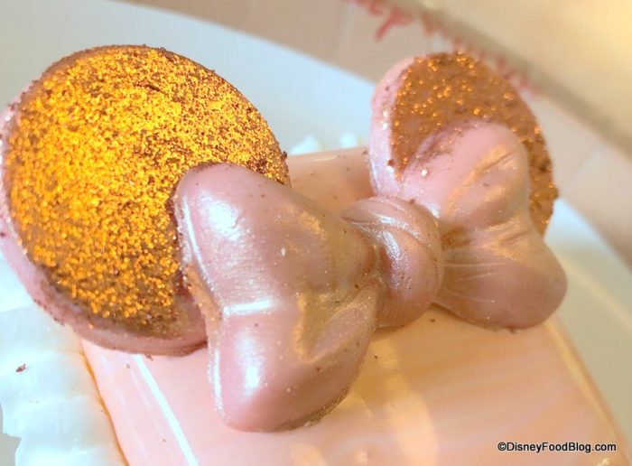 The Briar Rose Gold Ears on top are comprised of white chocolate discs and bow, tinted rose gold (er, sorry: BRIAR rose gold) and dusted with copious amounts of edible glitter.
