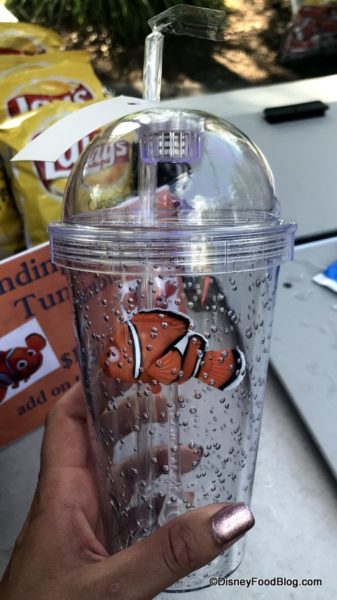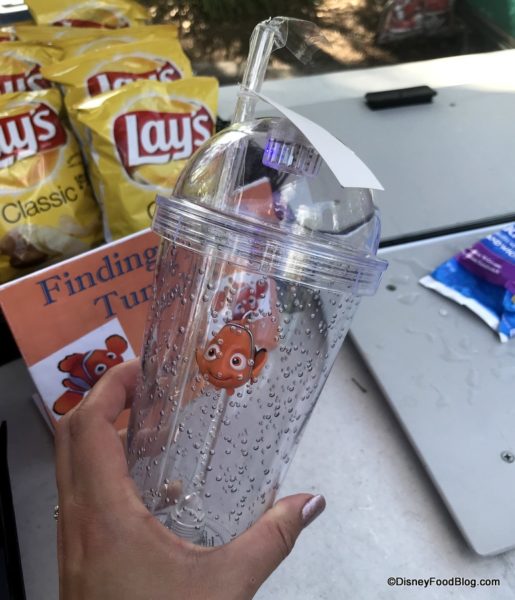 We spotted the tumbler at several drink and snack carts all around the park, so keep your eyes peeled for it! The cost for the Nemo Tumbler is $11.75 added onto the cost of any drink. Can you imagine Nemo floating in your drink?! So fun!