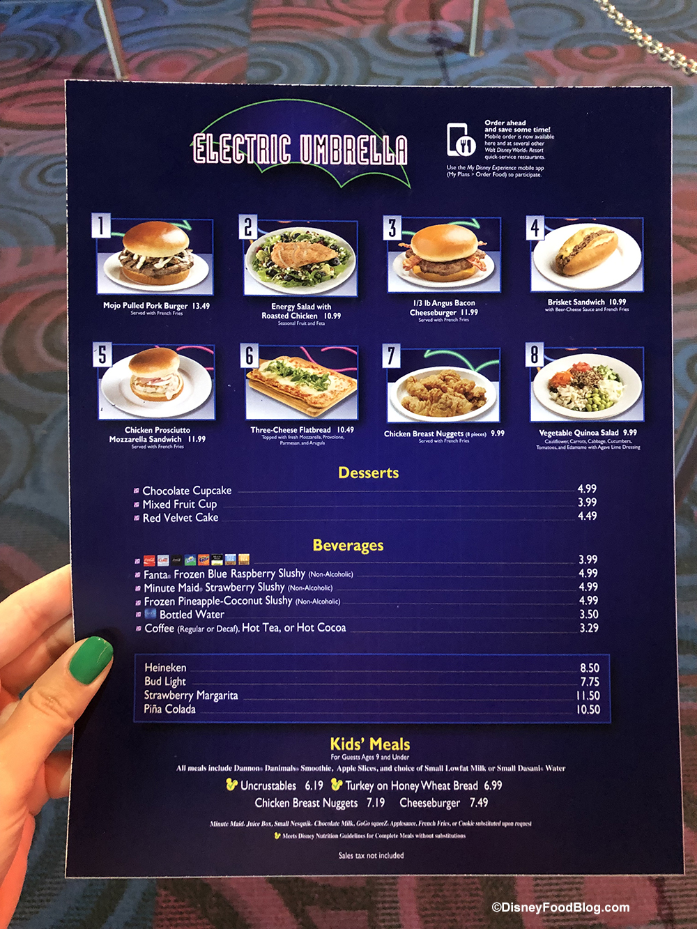 Electric Umbrella has added a new Chicken Prosciutto Sandwich and Cookie Crunch Brownie to their menu. The kids’ menu has some updates as well with the Mac and Cheese and Cheese Flatbread being removed from the menu.