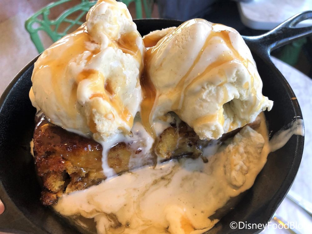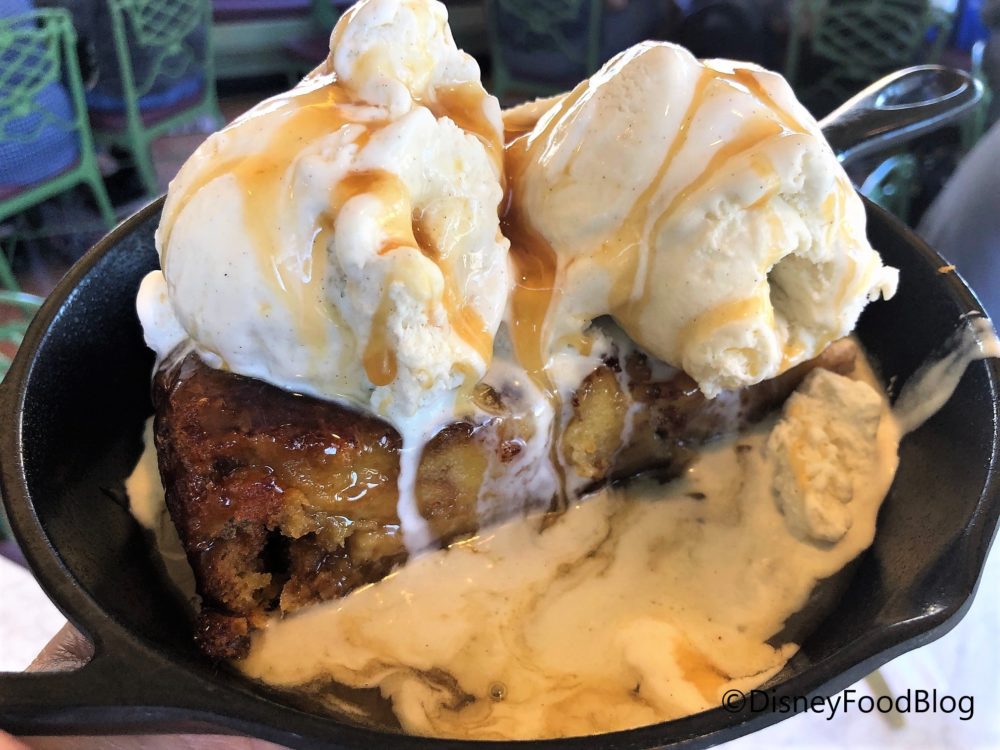The Butterscotch Bread Pudding is served in a cast-iron skillet, and comes topped with vanilla ice cream and caramel sauce.
