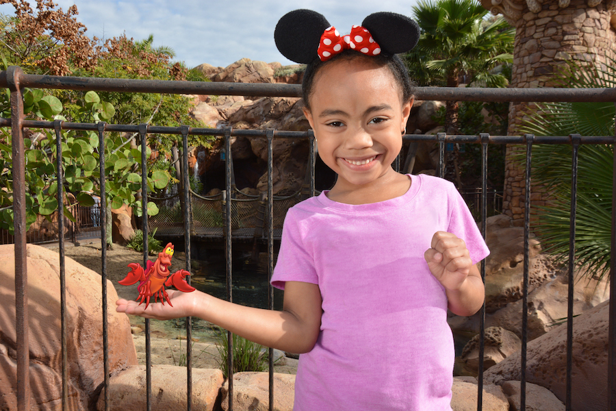 Look at this little sweetie! You and your little ones can take this adorable photo with Sebastian from The Little Mermaid near Prince Eric’s Castle!