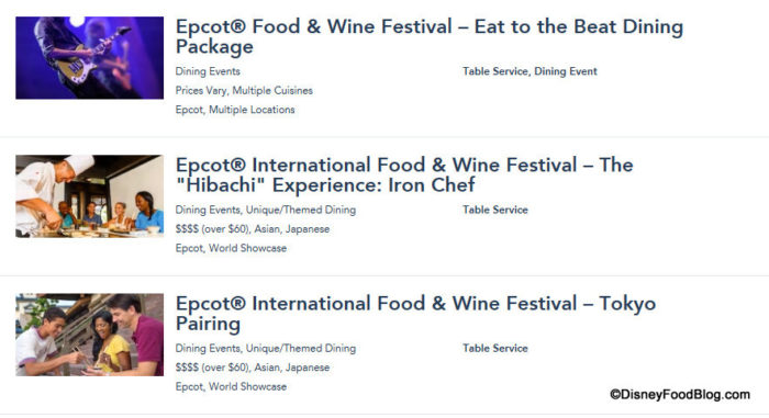 Also note that the two Special Event listings for the Japan pavilion have been slightly updated. The “Hibachi” Experience is now listed as Iron Chef (as opposed to the Year of Celebration) and the Tokyo Pairing is currently listed (as opposed to the Culinary Tour of Japan).