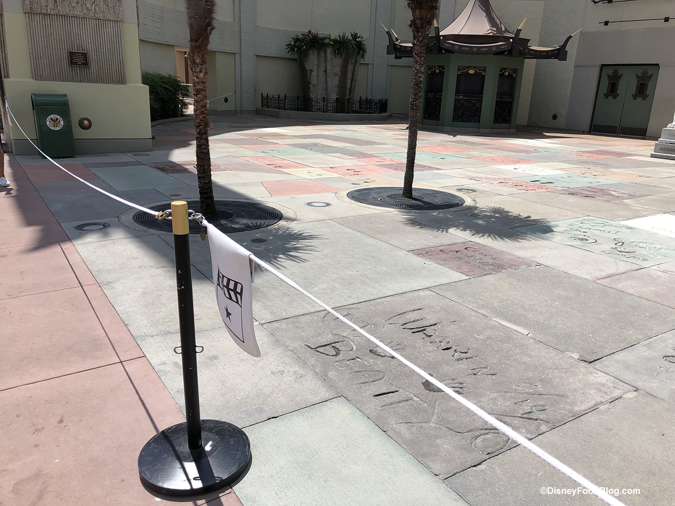 The square in the front of the Chinese Theater with the autographs, hand prints, and footprints of stars is still roped off.