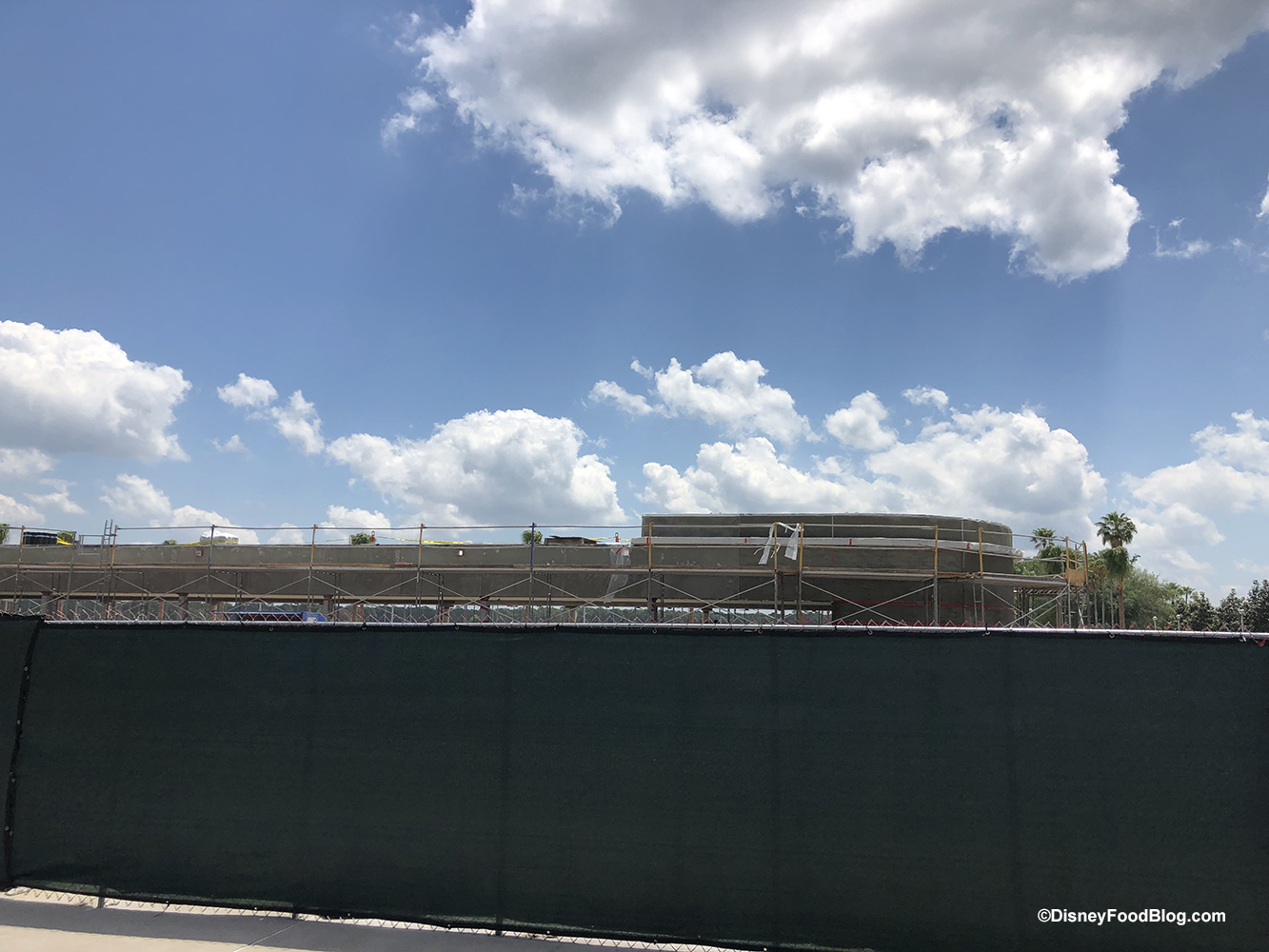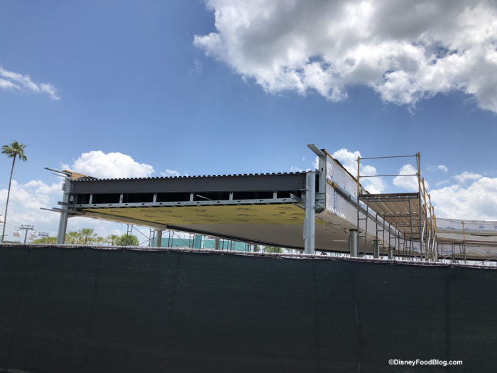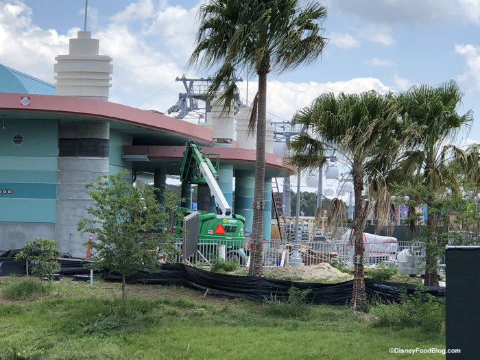 The Skyliner Station for Hollywood Studios is coming along — and you can see they were testing gondolas on the line when we were there.