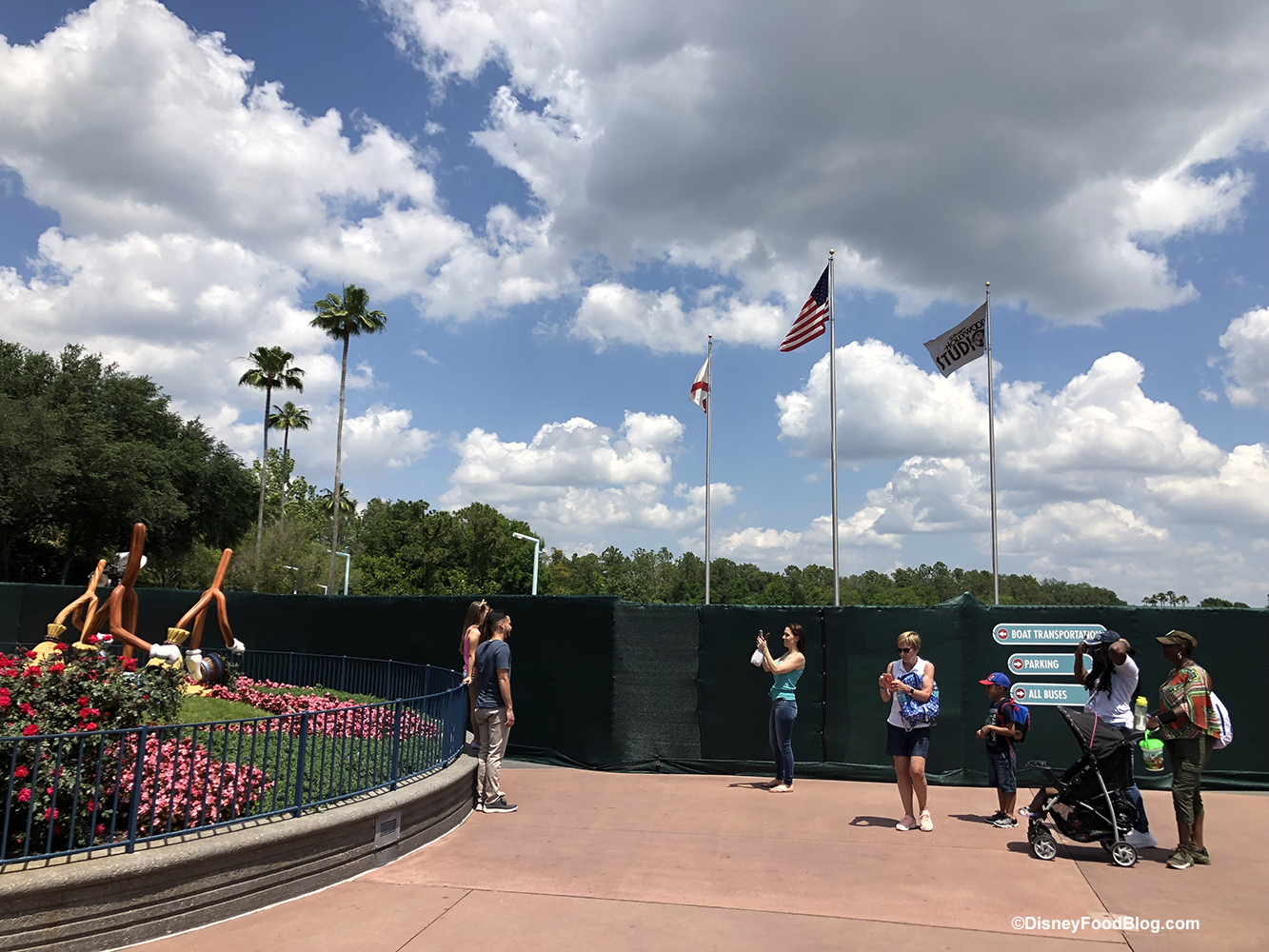 At the entrance area of the park there is some work happening around the flag poles. Don’t worry, you can still get your photos with the broomsticks and Topiary Sorcerer Mickey!